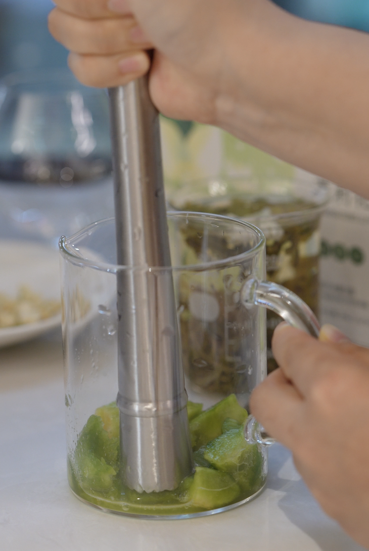 羊角蜜块捣烂,加入茉莉花茶,及适量糖浆搅匀后,加入冰沙