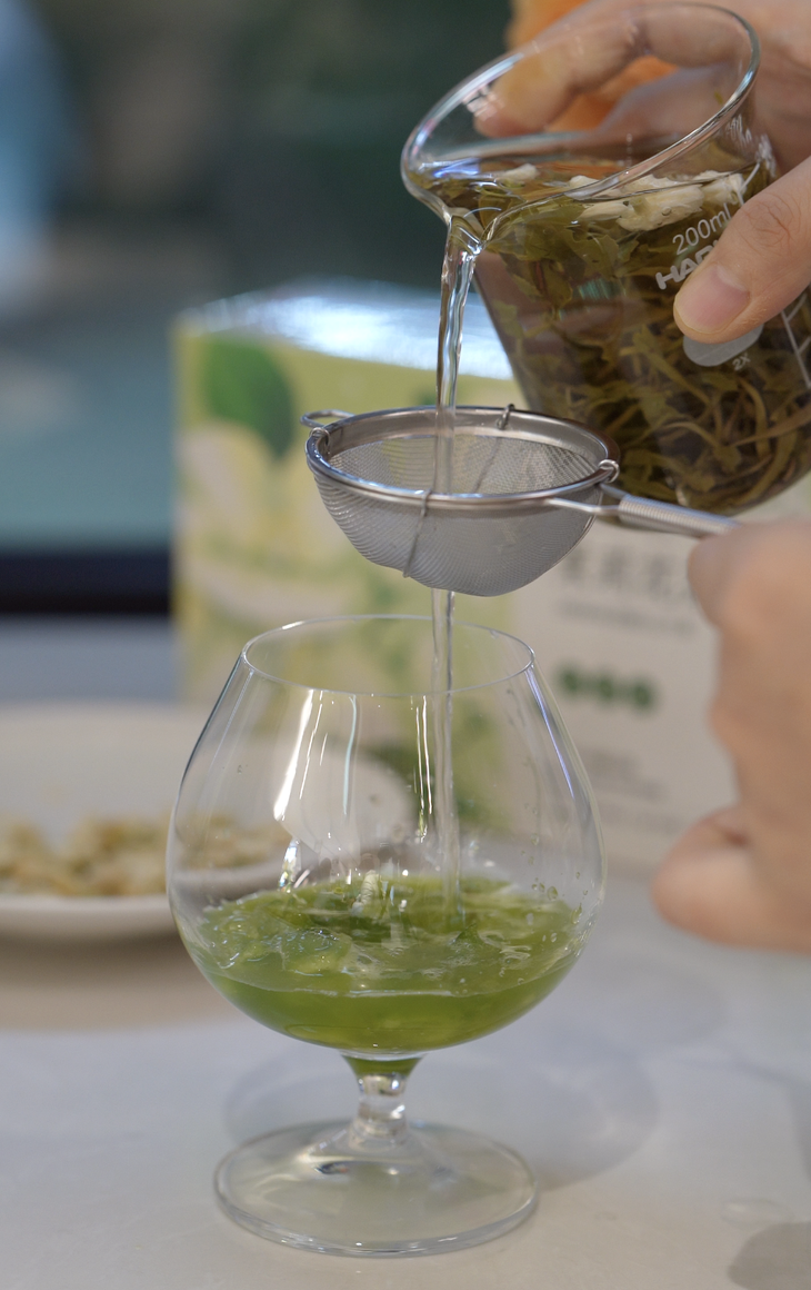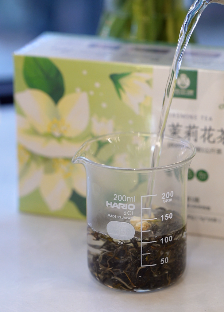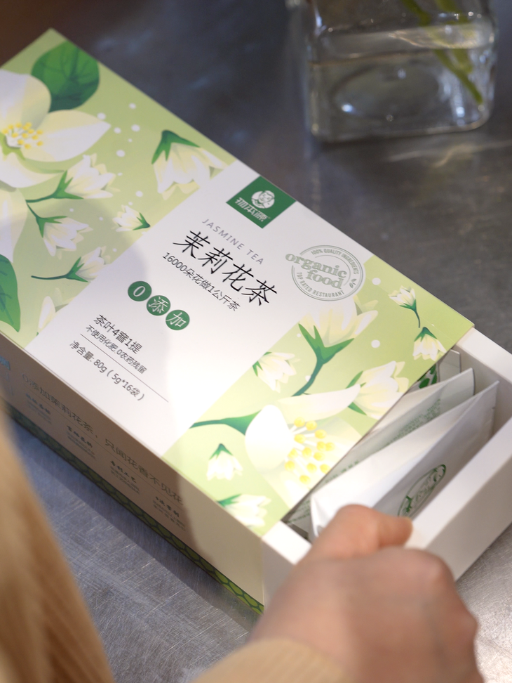 选用物本源茉莉花茶,茶叶四窨一提,16000朵花做1公斤茶