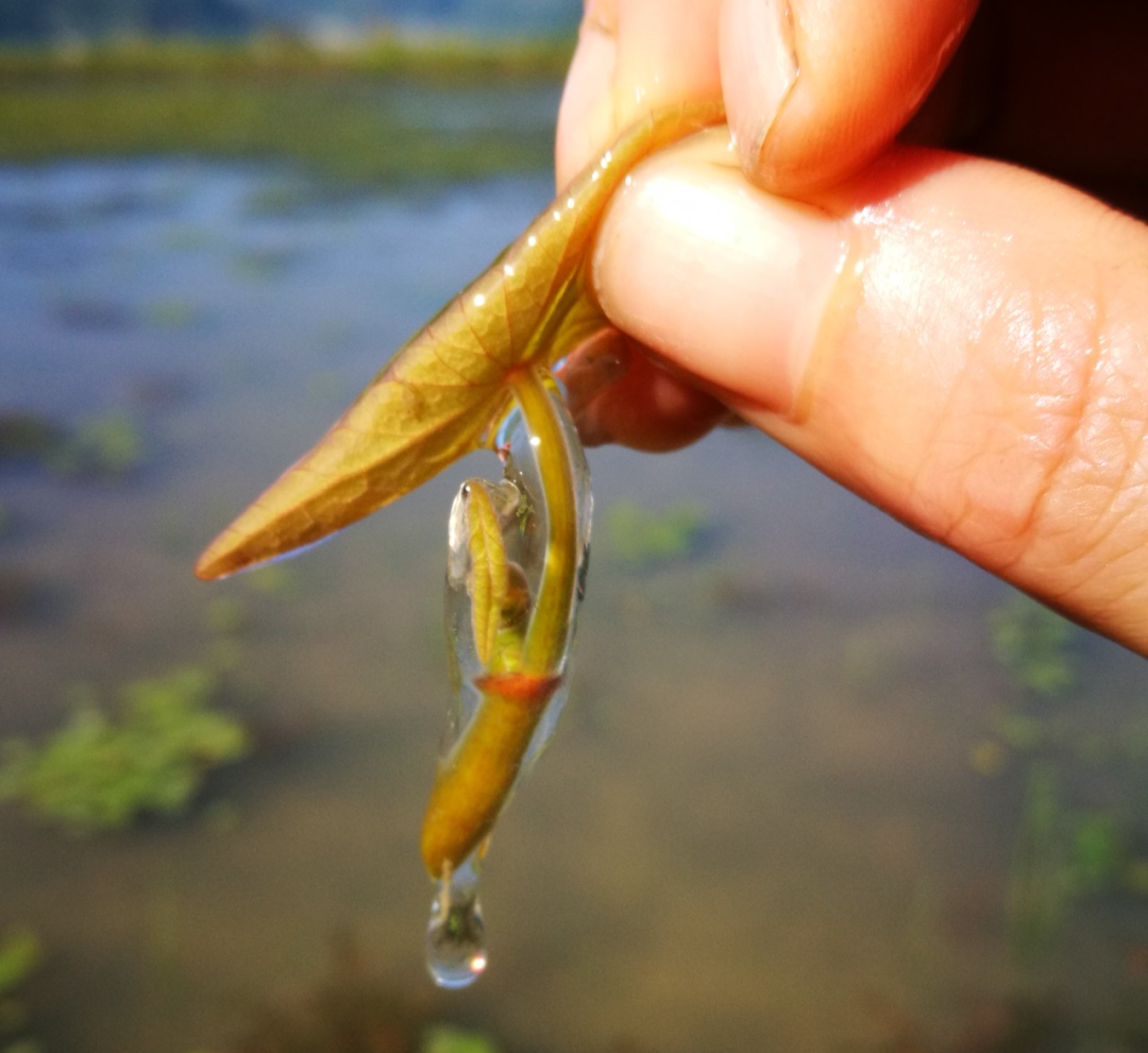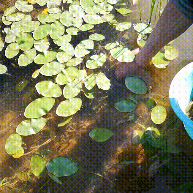 莼菜的胶质丰富,采的时候很容易从手里滑掉。要一片一片地掐下嫩芽,小心翼翼地保护胶质不脱落。