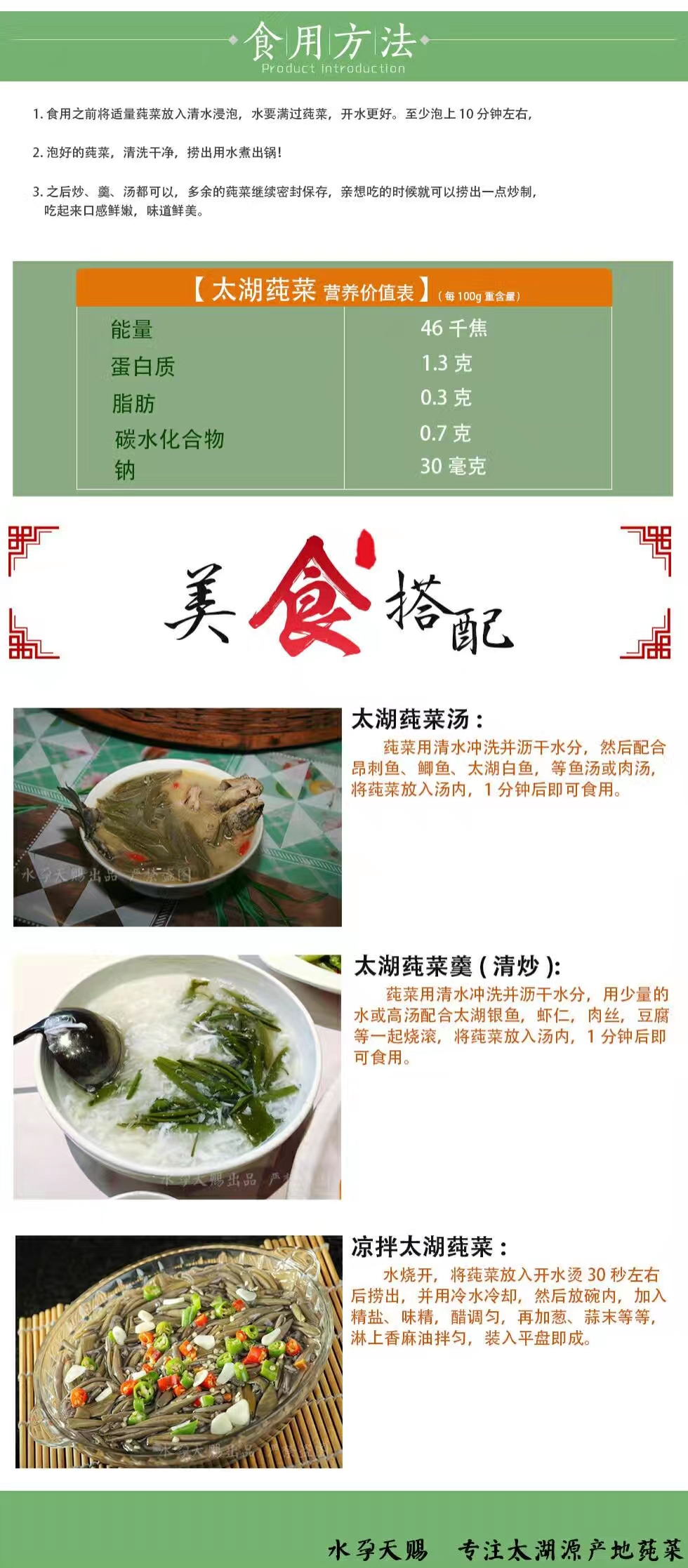 太湖莼菜幼叶与嫩茎中含有一种胶状粘液,食用时有一种细柔滑润清凉可口的感觉,并有一种沁人心肺的清香,口感好、风味独特。太湖莼菜食用方便,可配荤炒,可素食、可氽汤,也可做馅。