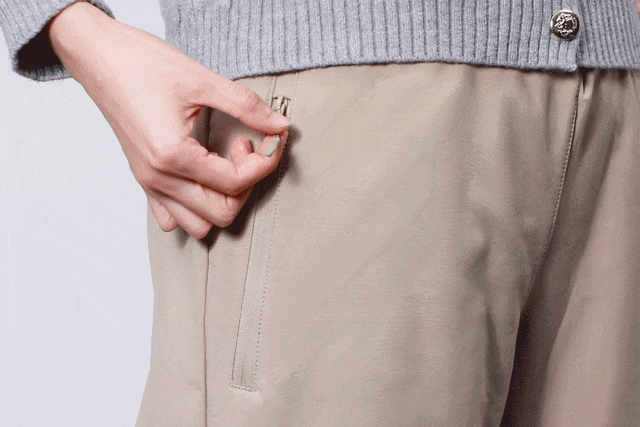高透膜贴肤面上的吸水性分子薄膜,吸收裤子内部的水汽分子导出到面料外部,减少湿冷的感觉。