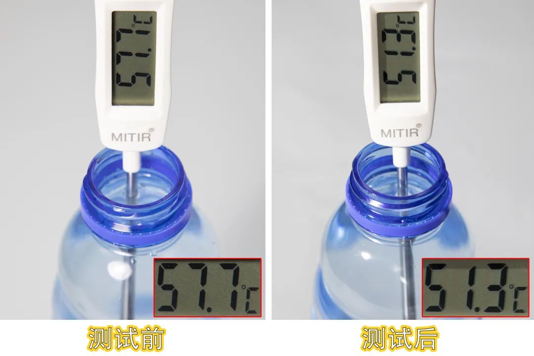 为了测试素湃裤子的隔热性,把一瓶57.7℃的水放进素湃气凝胶卫裤里,放进冰箱的冷冻室: