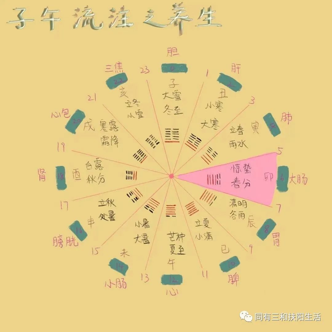 一日之中的卯时(上午五点至七点)对应一年之中的仲春(惊蛰、春分)。卯时日出,人也应该跟随太阳的脚步,起床了。
