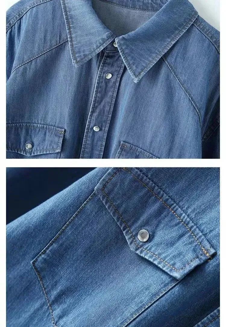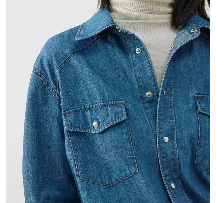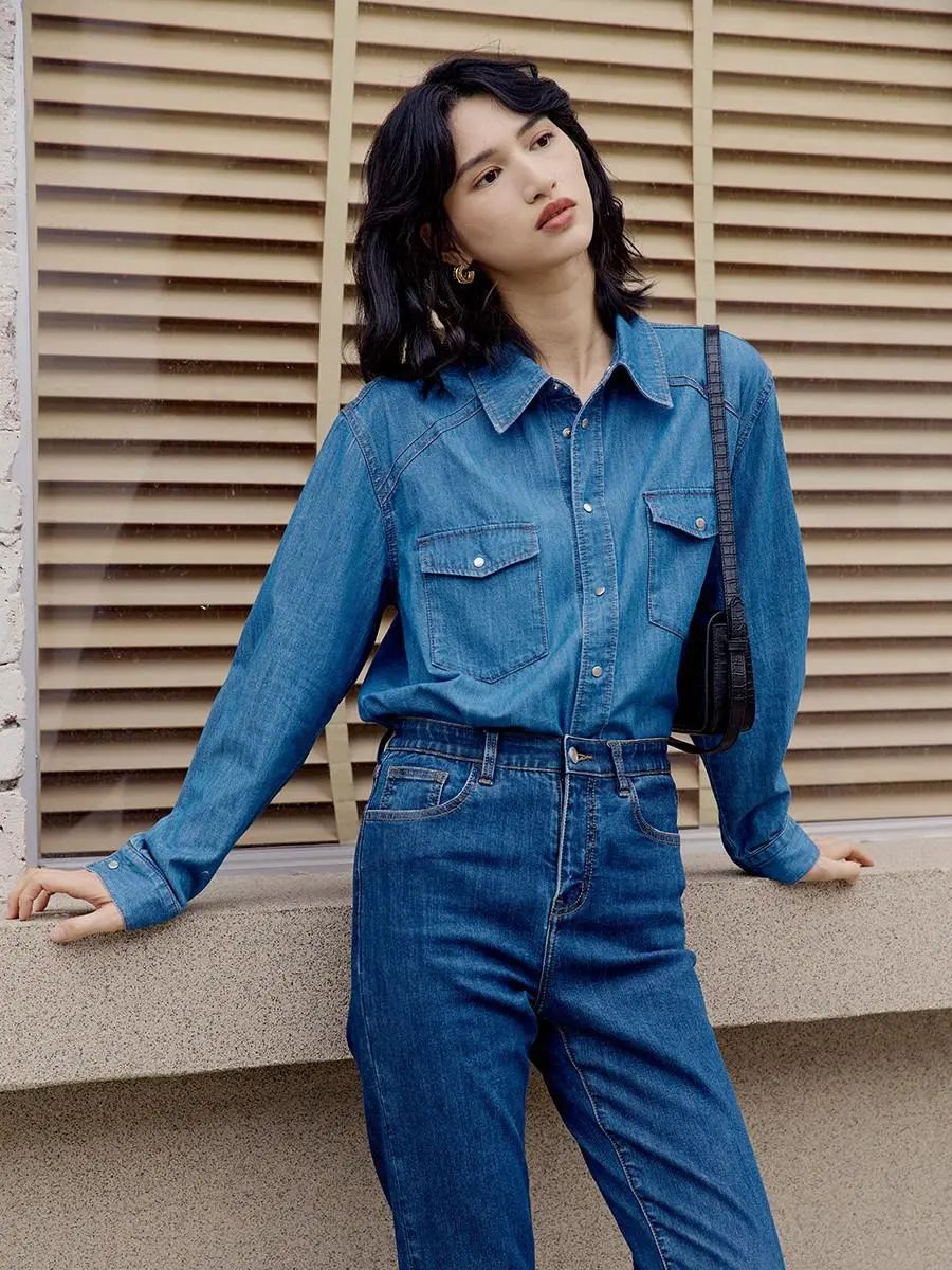 牛仔衬衫的面料偏薄,摸上去比较柔软,穿在身上不软塌,有一定的筋骨感,支撑起利落干练的气质,还能温柔和帅气兼顾。整体的复古感来源于经典的黄色配线,走线精致细密平整,经得起细看。