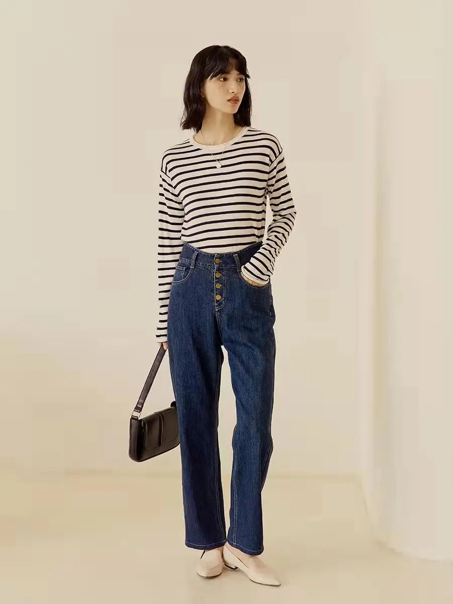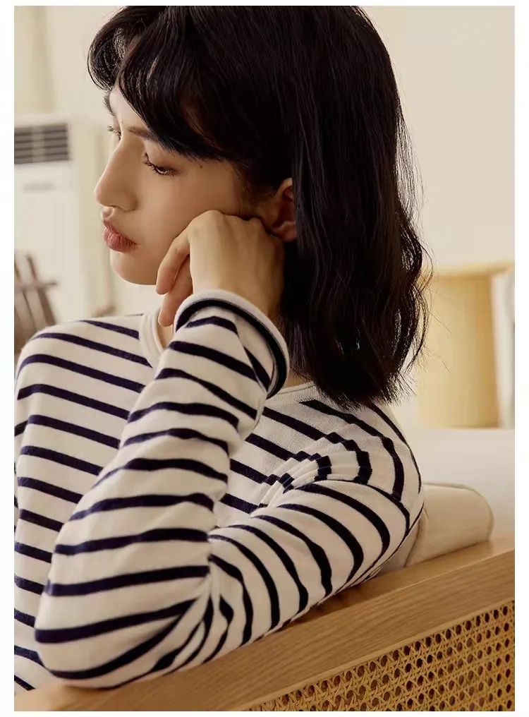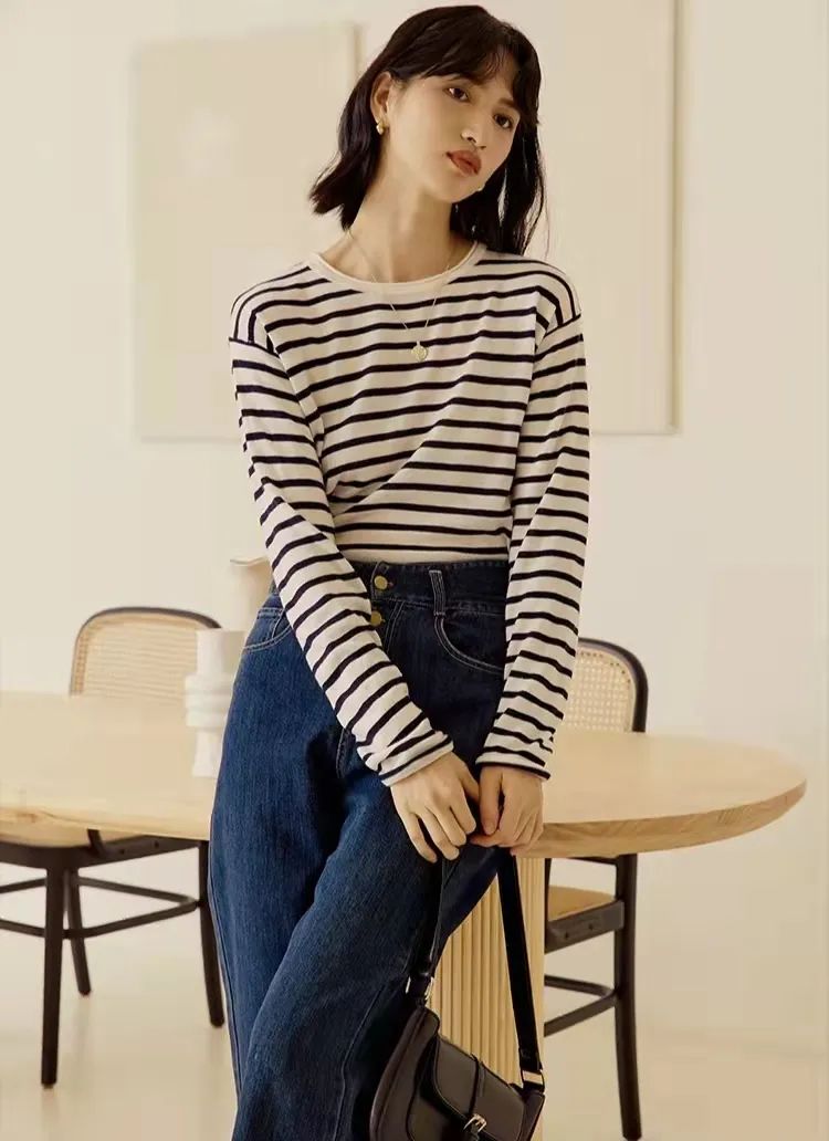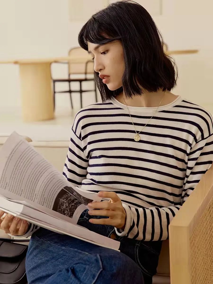 我们给大家挑选的这件是HeyDress薄款羊毛打底衫,和牛仔衬衫同品牌,搭配起来也特别舒适和谐。每个精致爱生活的女人的衣橱里,都应该有一件条纹衫。