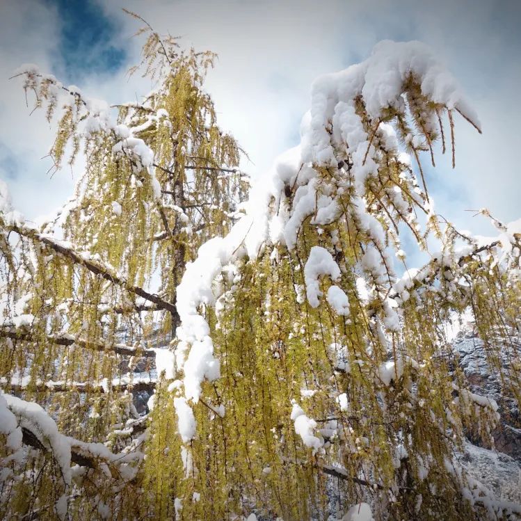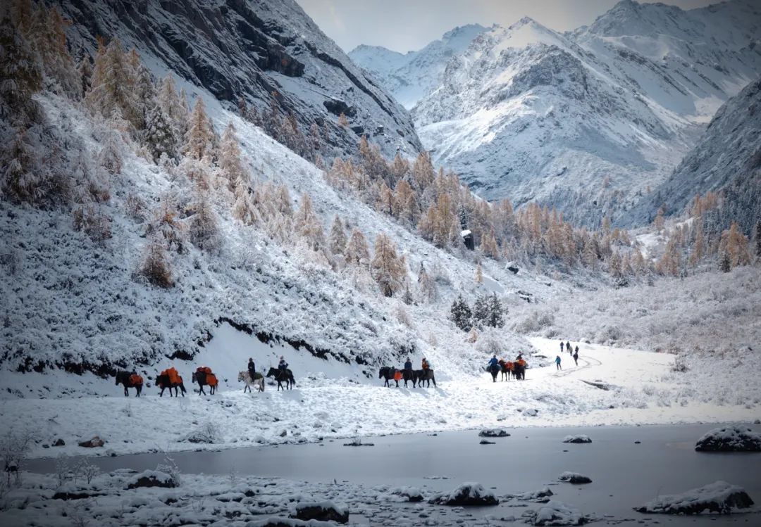 还没从第一天的秋景中反应过来,次日早晨6点拉开帐篷,整个营地盖上了一层薄雪,几匹马乖乖的站在雪地里。远处的山相比前一日的黄,多了白色的拼接,依次被太阳照亮,这对于一个南方人来说简直真是莫大的惊喜。
