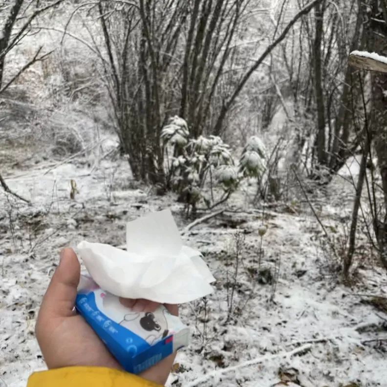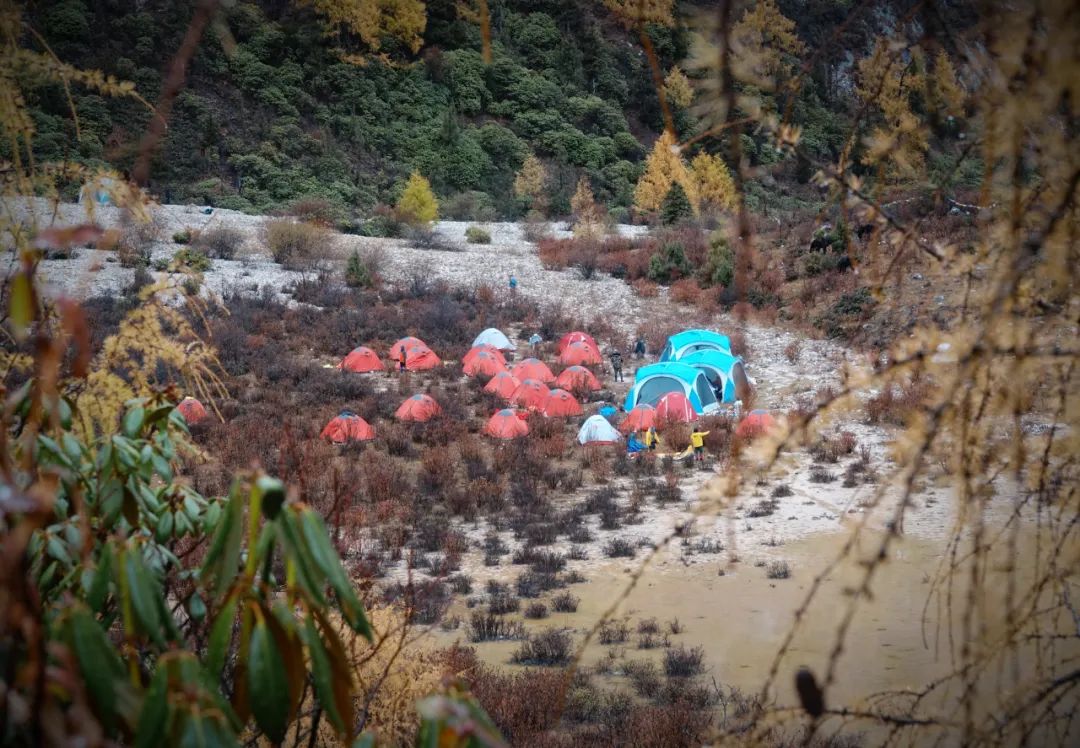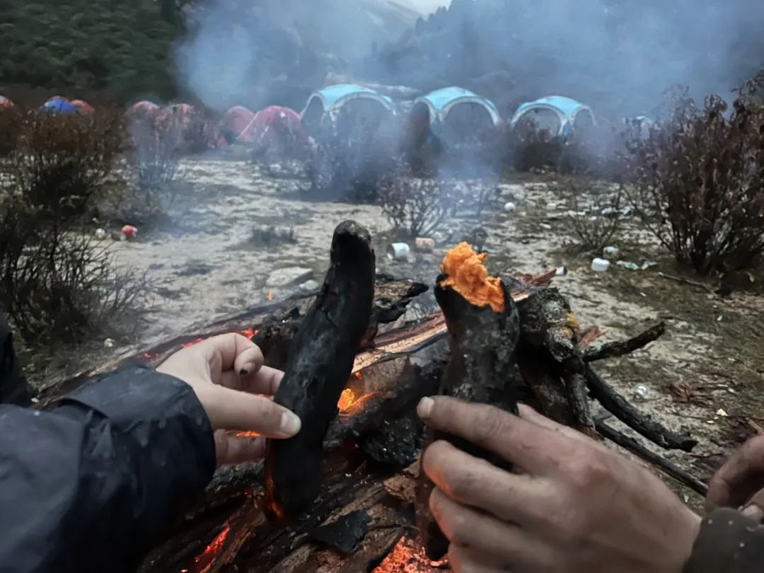 晚上回到营地,雪越发下大了。到了晚上8点,帐篷已经积满了雪。所有领队每2小时换班给帐篷“挖雪”。我来回在营地里走动,兴奋得无法入睡。在其他人都回帐篷后,我和一位杭州的女生在篝火大概又坐了2个小时,也不需要特别的说话,就打着伞淋雪,等雪积满了我再动作浮夸的抖掉。