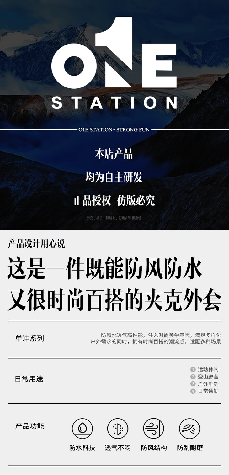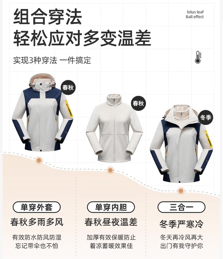 在寒冷的冬季,当需要保暖时,可以将内胆和外层组合在一起,形成一件保暖性极佳的冲锋衣;而在天气较为温和的时候,可以只穿着外层,享受其防风防水的功能;如果天气炎热,甚至可以单独穿着内胆,作为一件轻便的保暖衣物。这种多功能的设计使得冲锋衣能够适应从寒冷到温暖的多种天气条件,大大提高了其使用的灵活性和实用性。