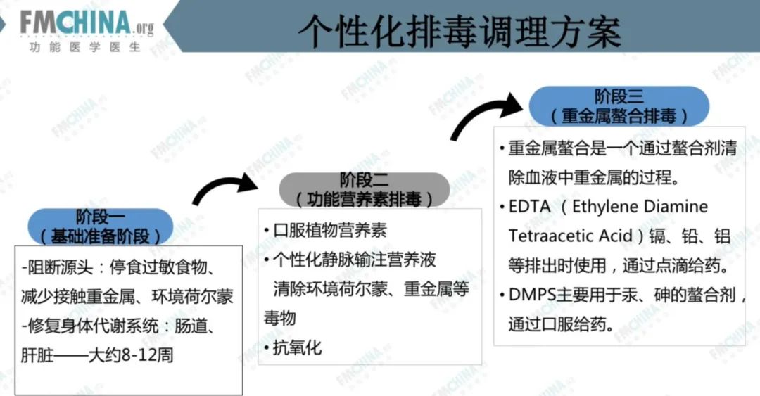 从基础准备阶段提升到功能营养素的排毒过程,最后进入重金属螯合排毒。在这个过程中基础的准备阶段非常重要大概需要8—12周。大部分重金属进入人体后,沉积部位是肝脏。所以我们在整个排毒过程中首先需要对肝脏进行排毒以及对于胃肠道进行调理。