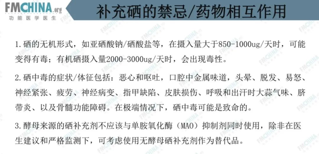 酵母硒来源的硒补充剂不应该与单胺氧化酶抑制剂同时使用。如发生这种情况,需要考虑使用无酵母硒补充剂作为替代品。