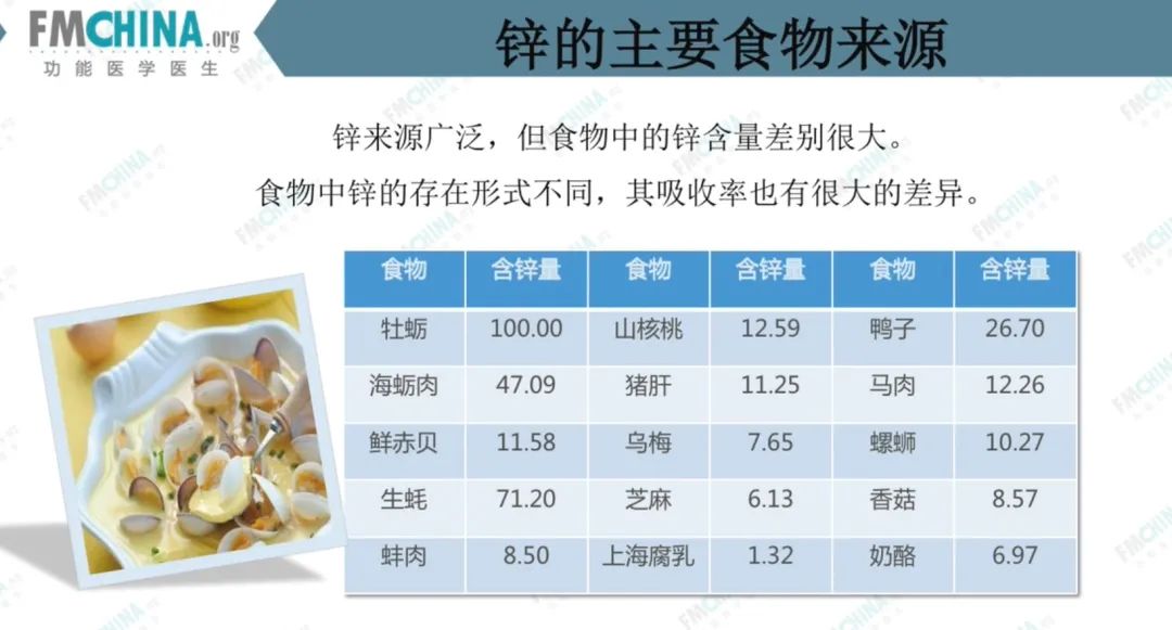 锌是人体必需微量元素之一,参与人体内三百余种酶和功能蛋白的组成,对代谢活动也起着调节作用。锌的缺乏包括以下两个原因:(1)摄入不足(2)消耗过多。锌的来源非常广泛,但食物中锌的含量差别较大。食物中锌的存在形式是不同的,吸收率也会有很大的差异。在这里罗列了部分食物中锌的含量,供大家参考。(图四)