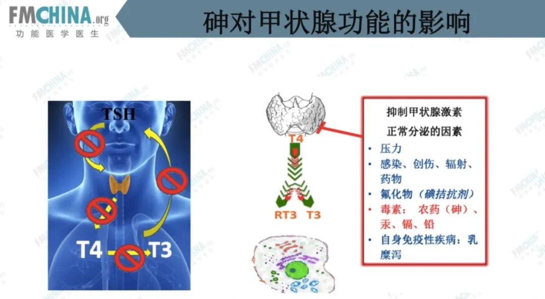 在甲状腺代谢过程中,重金属影响激素的代谢和合成过程,其中包括砷、汞、镉和铅。砷对甲状腺合成的影响主要集中在对T3、T4。在T3转化过程中起到这个抑制作用。