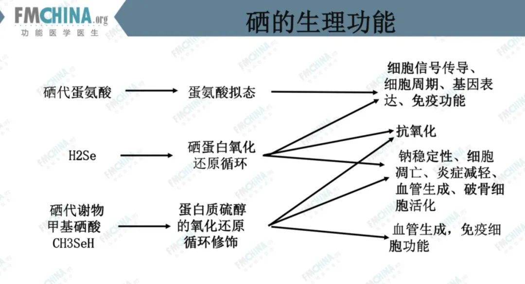 硒进入人体之后,通过代谢参与人体生理功能,包括细胞信号传导、细胞周期、基因表达、免疫功能、抗氧化等。(图二)总结而言,硒属于人体必需的微量元素,硒和锌对镉有协同的保护作用,在内分泌代谢免疫功能中维持细胞内稳定硒发挥着重要作用。硒蛋白在甲状腺中具有重要的抗氧化活性,有助于清除氧自由基。硒与甲状腺素脱碘酶结合,在甲状腺激素代谢过程中起着很重要的作用。同时需注意到。甲基汞和硒具有很高的亲和力,增加的甲基汞可能会螯合硒,使其无法用于甲状腺激素的转化。