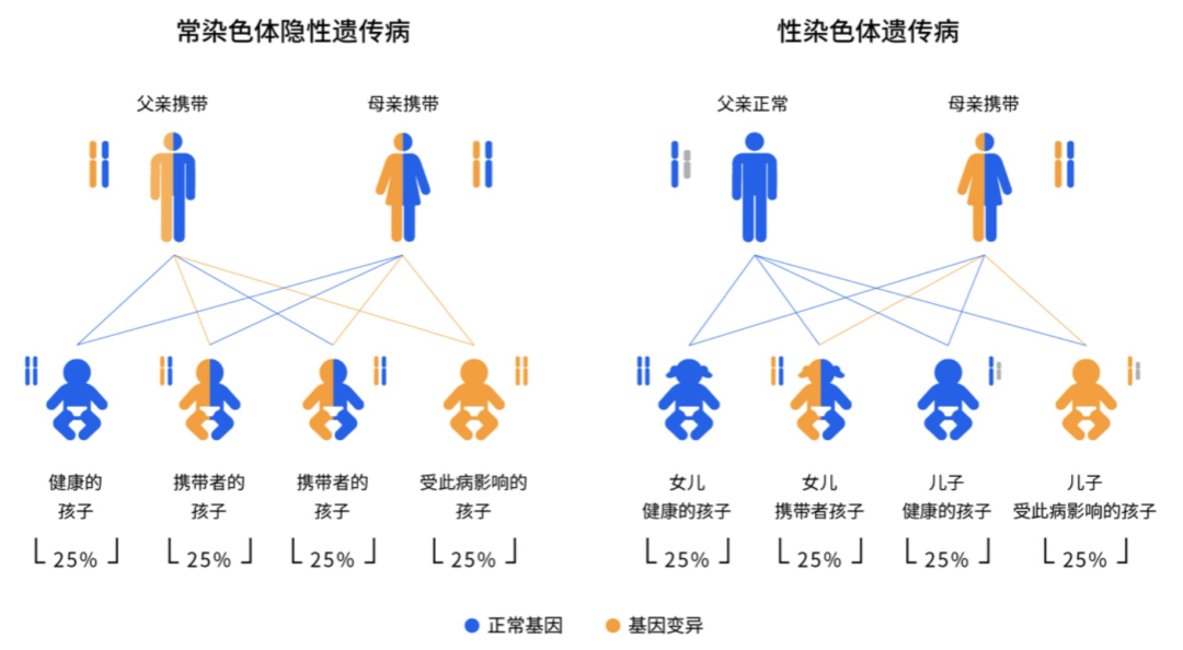 当夫妻双方都携带了致病变异,每次生育,子女有 25% 的可能健康,50% 的可能成为携带者,25% 的可能患病。