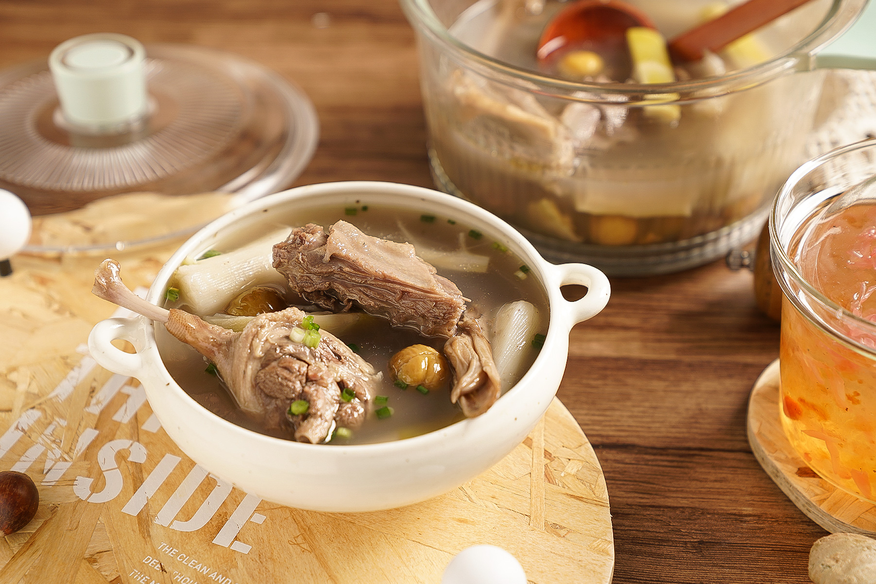 10.盛出后可以切点葱花(分量外)撒上,鸭肉已经完全酥嫩了,但还是保持完整的形,因为鸭肉脂肪含量相对低,喝起来也没有过多负担。
