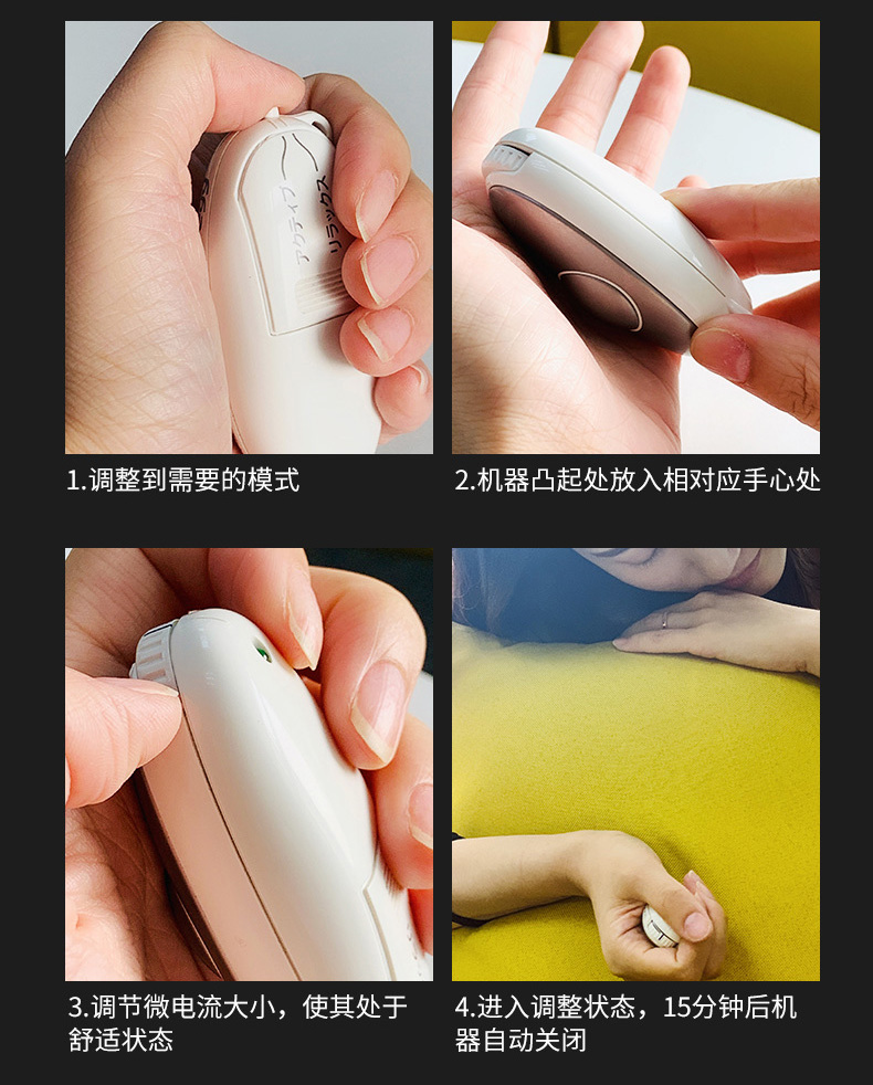 ① 在失眠的时候,选择睡眠模式,将Pulse egg放于左手,机身会产生周波微电流,对左手掌心劳宫穴进行刺激,将特殊波形电流传导到右脑睡眠区域,分泌促进睡眠的褪黑素、内咖肽、5-羟色胺等激素,从源头入手,改善睡眠。同时,微电流刺激手心,会让注意力从思考其他事情转移到手心,治标又治本。