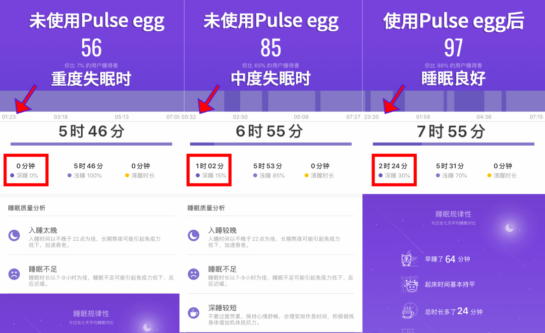 使用Pulse egg之后,入睡时间从00:30变到了23:20左右,提前了将近1个小时;深度睡眠由0~1小时变到了2小时,增长了1小时。入睡时间、深度睡眠时间,两项都有所提高。