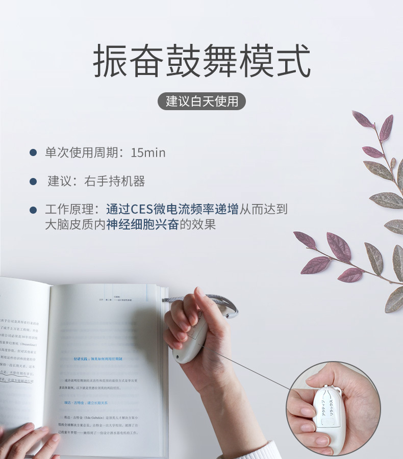 ② 在注意力不集中、情绪低落的时候,选择鼓励模式,将Pulse egg放于右手,通过微电流刺激生活工作区域的左脑,分泌调节情绪的“信使”,将影响情绪的异常脑电波“拨乱反正”,从源头入手,改善情绪。