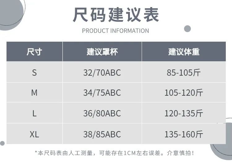 考虑到各位姐妹胸型&大小不同,设计了S、M、L、XL四个尺码。