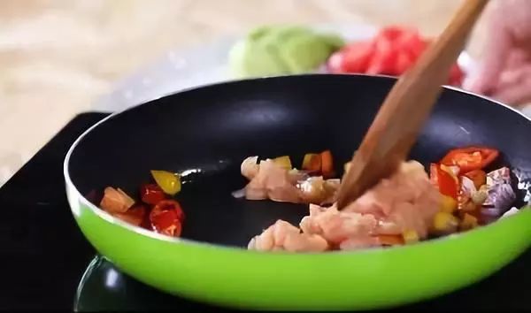 放入洋葱和鸡心椒爆香,随后加入鸡肉丁翻炒。