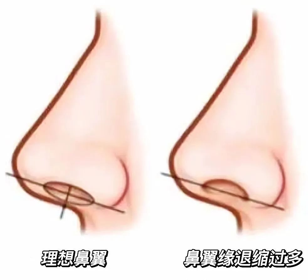所谓的鼻翼缘退缩,实际上是鼻孔长轴线与鼻翼缘和鼻小柱的位置关系。理论上理想的鼻翼缘和鼻小柱关系是,长轴线距鼻翼缘和鼻小柱缘两端距离各为1-2mm。如果超出这个范围就是鼻翼缘退缩了,轻度的鼻翼缘退缩在2-3mm,中度鼻翼缘退缩4mm左右,重度退缩则会超过5mm。导致鼻翼缘退缩的情况基本有三种:一是先天性鼻翼缘短;二是医源性获得的鼻翼缘退缩,这种情况通常出现在短鼻延长后,鼻尖往前拉伸,引起鼻翼缘相对的后缩所致。三是挛缩鼻造成的鼻翼缘退缩,有感染过或多次手术创伤的,引起鼻子挛缩变短,鼻尖和鼻头、鼻翼一起上旋导致鼻翼缘退缩。对于鼻子方向的问题: