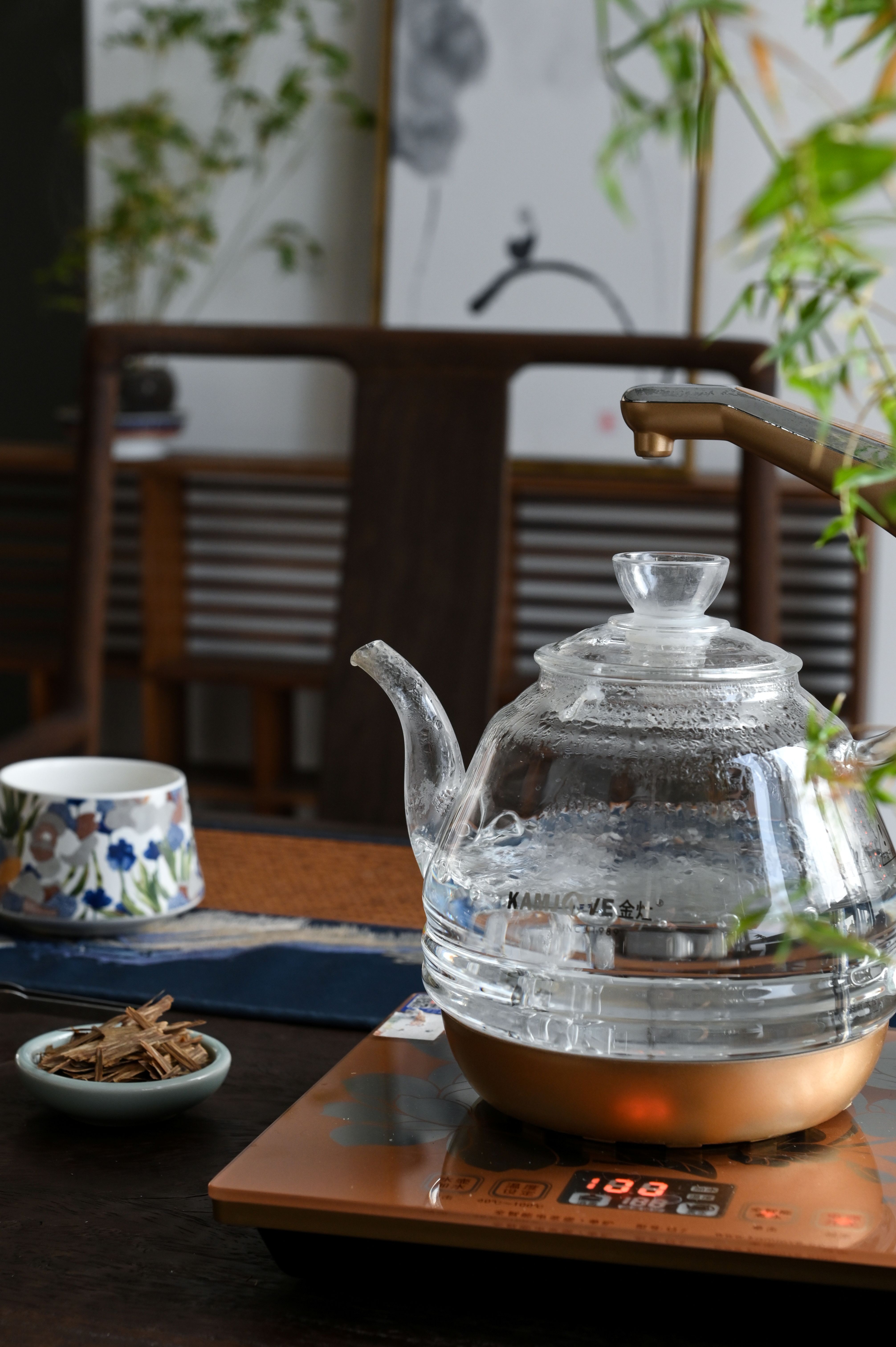 1、取适量沉香煮水料放入煮水壶内胆中(或者放入银质茶滤中)再放入煮水壶。