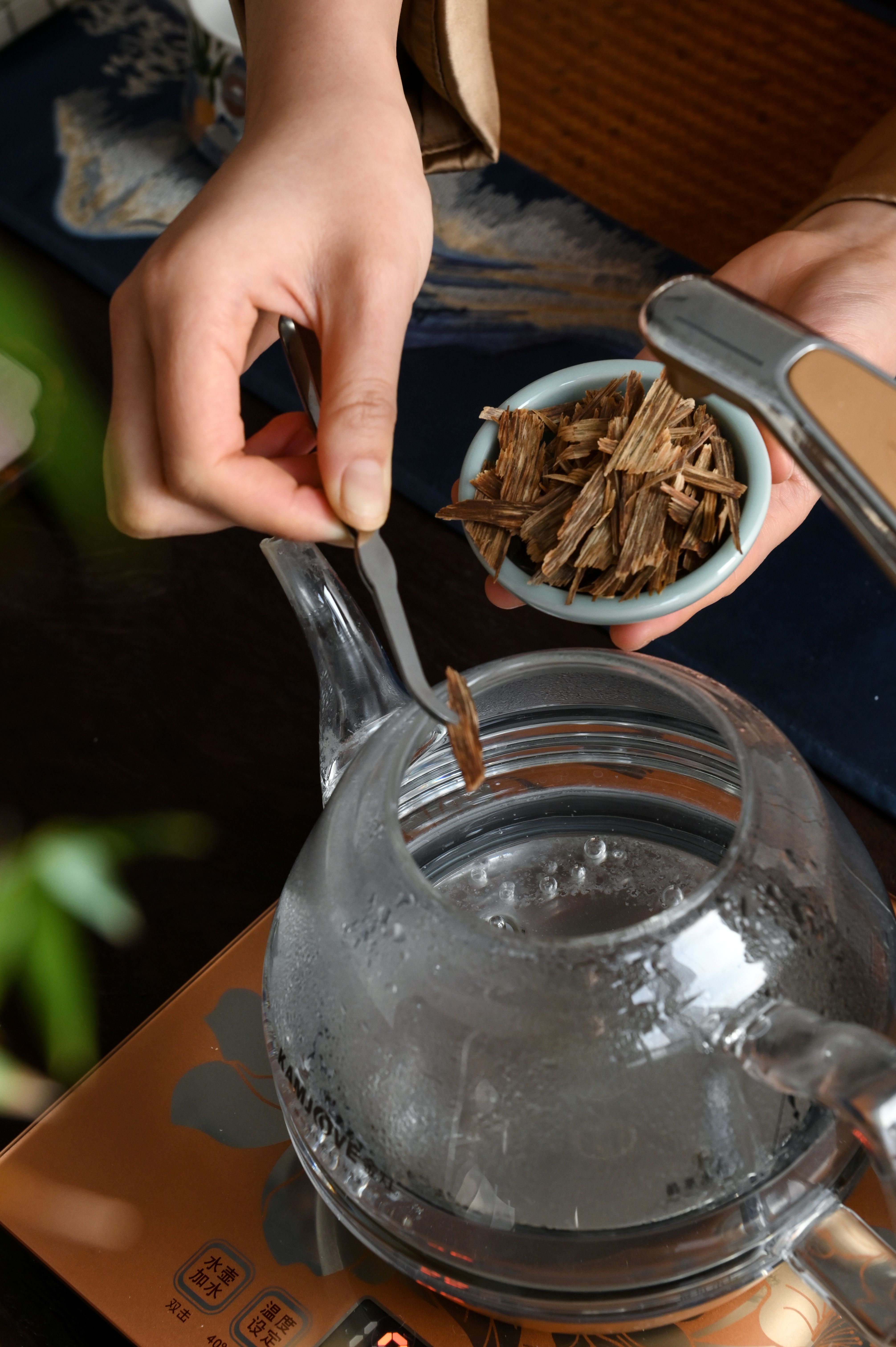 3、一次喝完,取出沉香料,放到阴凉处阴干,可反复冲泡。