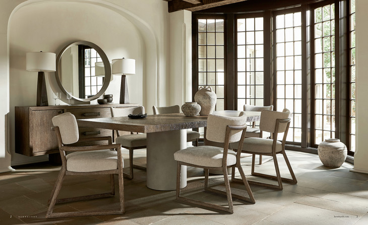 这款Casa Paros长餐桌 温暖、轻松、宁静,从有机自然主题中找到灵感。两个圆形树脂底座采用树脂铸造而成,具有仿混凝土饰面的石材质感,赋予雕塑感,粗粝却质朴迷人。充满天然纹理的木质桌面,实现对比材料的完美平衡。流畅大气的线条和柔和温暖的气质,营造出宁静轻松的餐厅氛围。