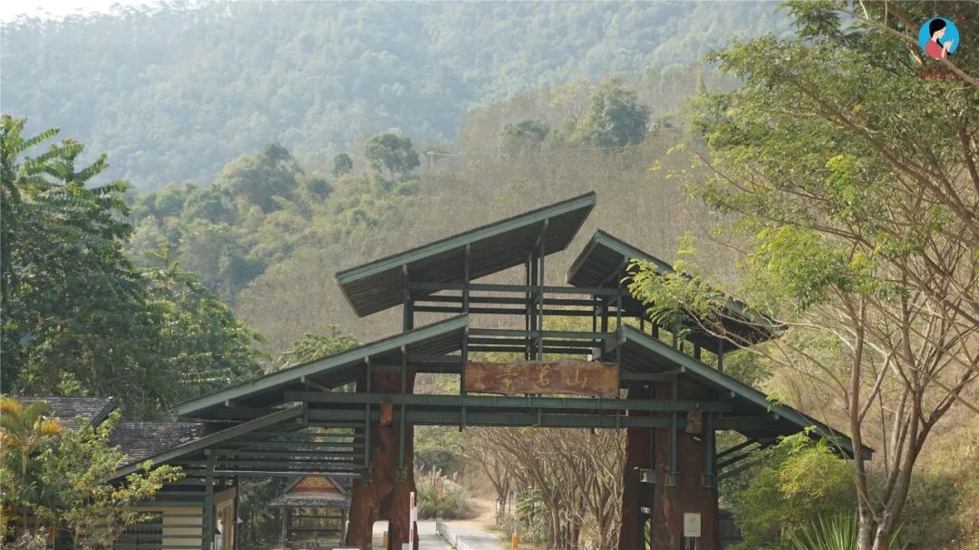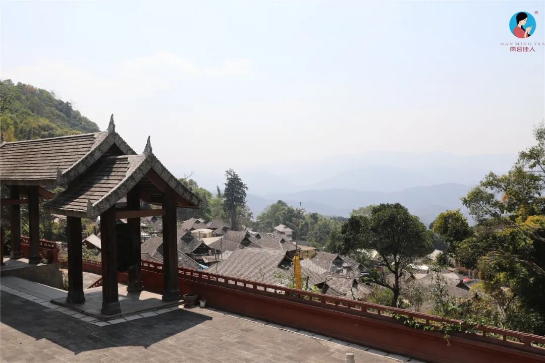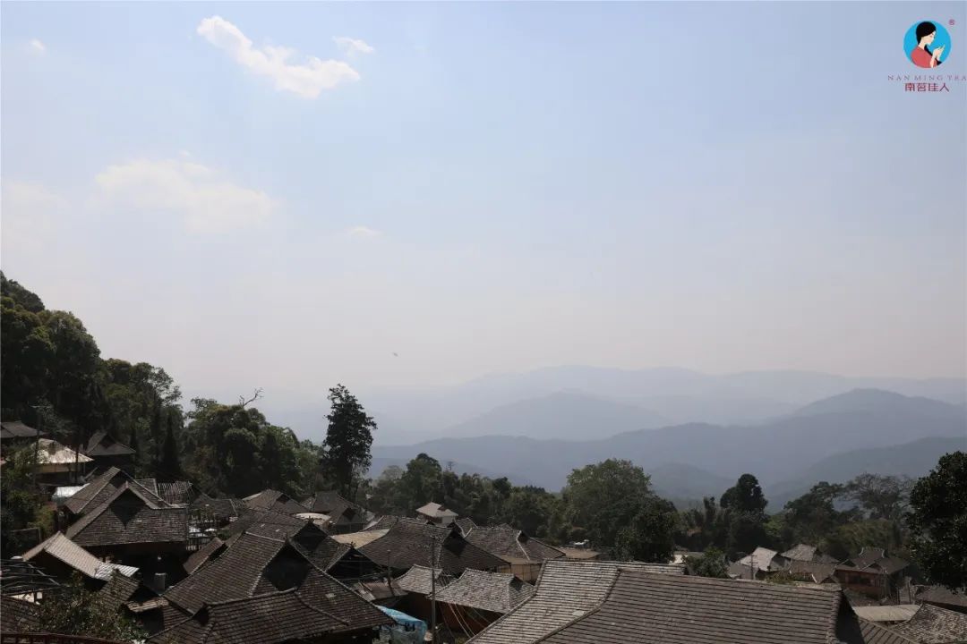 进入景迈,途经有名的观景台,登高望远,春光无限明媚,远处是景迈茶山的村寨,被墨绿色包围着,近处是春意盎然的古茶园,犹如世外桃源。