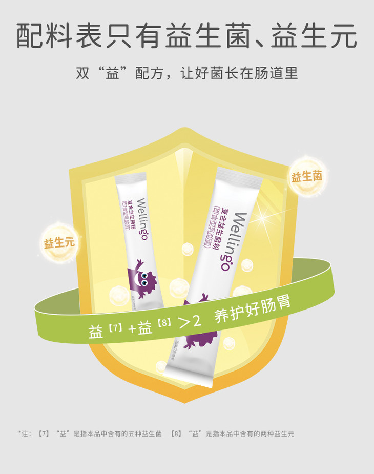 Wellingo这一款益生菌,添加低聚果糖+水苏糖两种益生元,活性更强大,让有益菌群长在宝宝肠道里,给宝宝更强有力的肠道呵护!