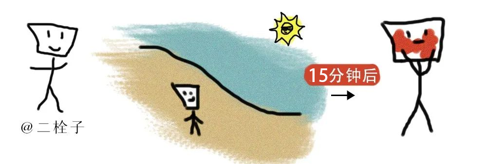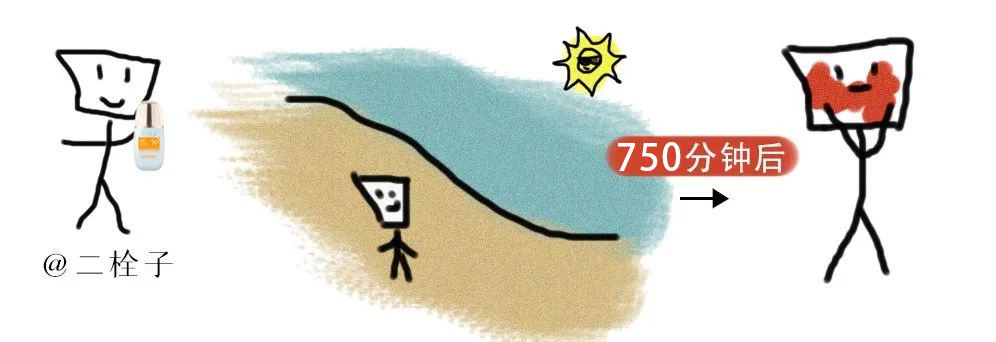 二栓子不涂防晒,走到盛夏正午海滩的阳光里,15分钟晒伤了。 二栓子涂了这个防晒霜,仍然走到盛夏正午海滩的阳光里,12.5个小时(750分钟)之后晒伤了。