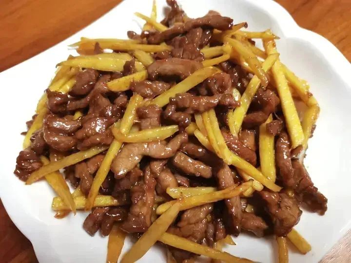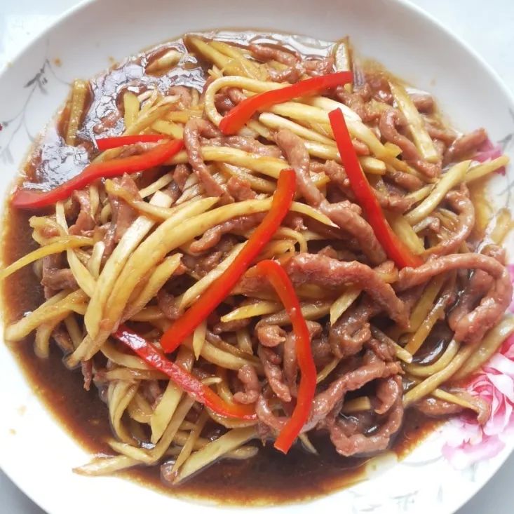 一道开胃好吃的嫩姜炒牛肉丝就可以上桌啦~牛肉滑嫩不干柴、姜丝脆爽辛香,很有层次感,配米饭一绝!