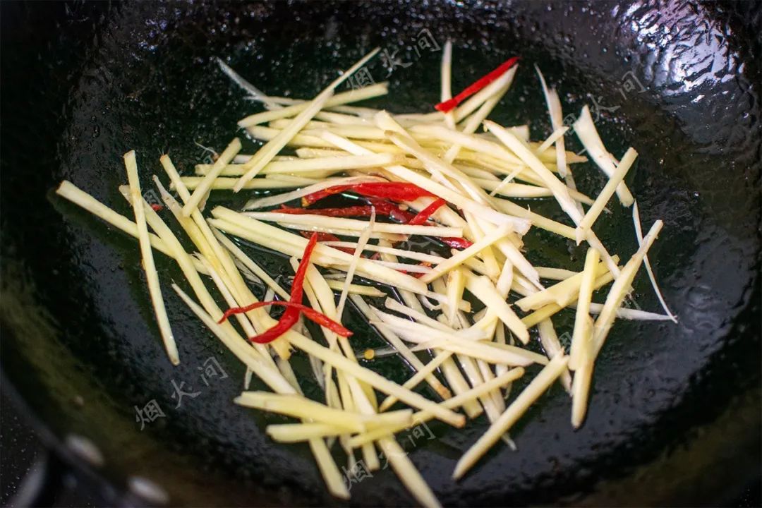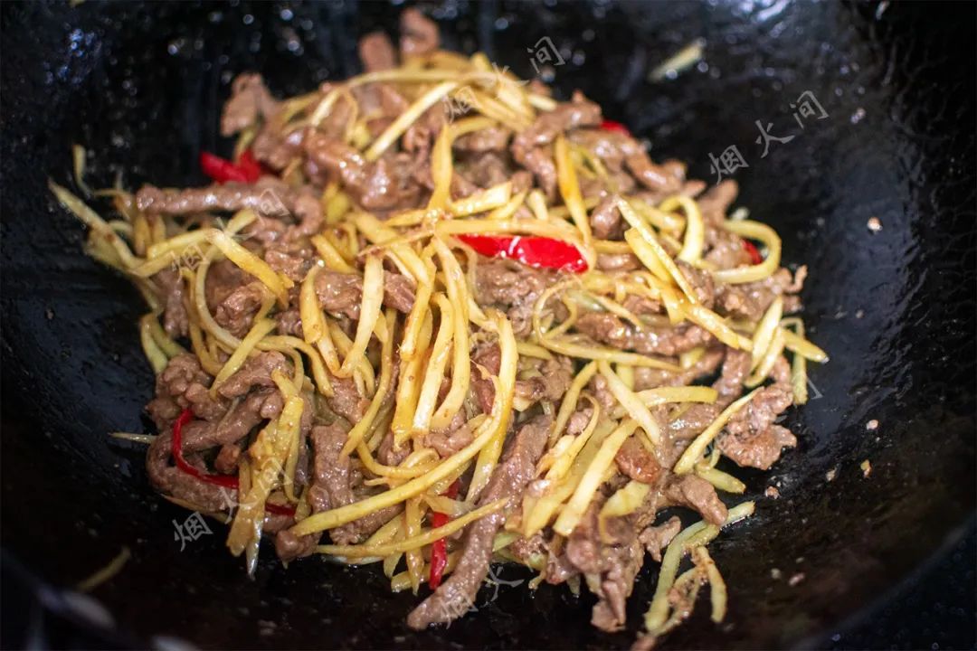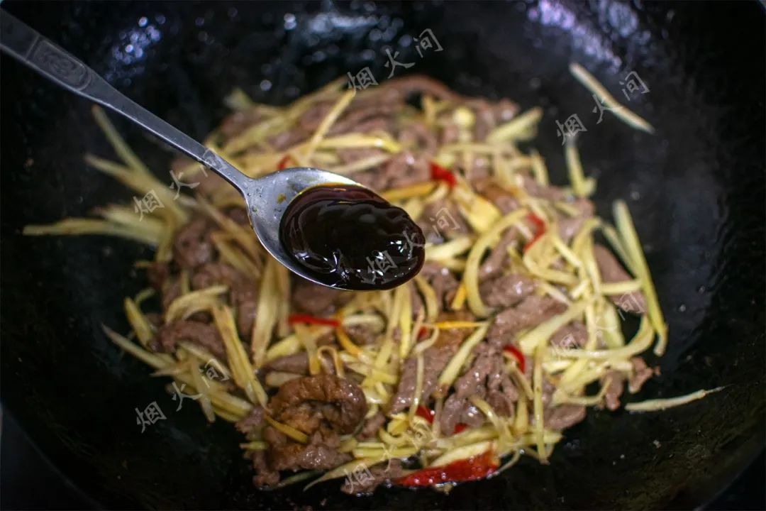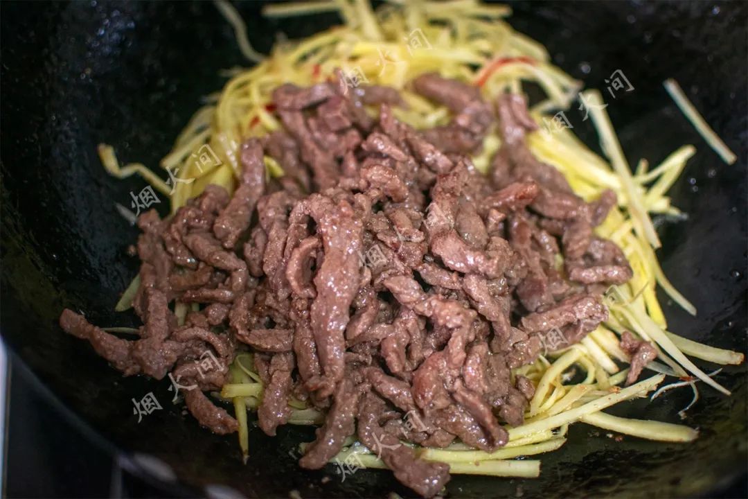 4. 原锅留少许底油,先放入没有腌制过的生嫩姜丝和红椒丝炒香。再放入腌制好的酸姜(挤干腌料汁)一起炒匀。然后放回牛肉丝大火翻炒。