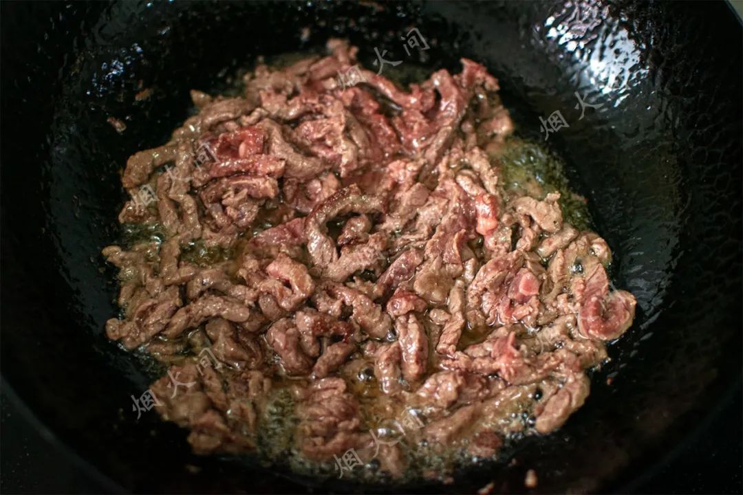 3. 热锅倒入多一点食用油,放入腌制好的牛肉丝,大火炒至变色立即盛出。