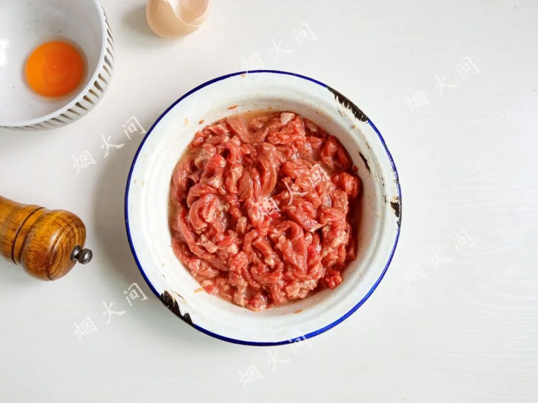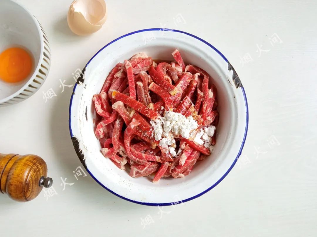 2. 牛肉切粗丝,加入腌肉料(除食用油外)反复抓拌,被牛肉完全吸收。放入食用油拌匀封面,腌制30分钟以上。
