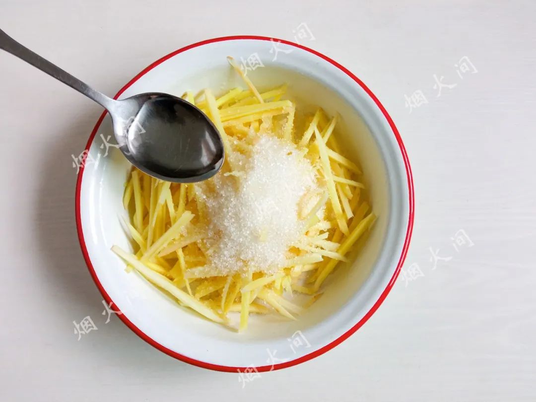 1. 嫩姜切丝(姜不用切得太细,略粗一点口感更好。)。取一半的嫩姜丝加入白糖、白醋,腌制1-2小时以上(这一步是为了让姜变软入味,成为速成版的酸姜,是这道菜别具风味的小窍门哦)。