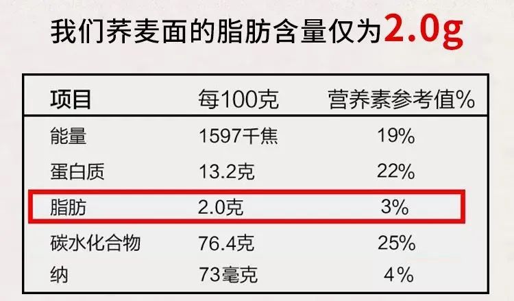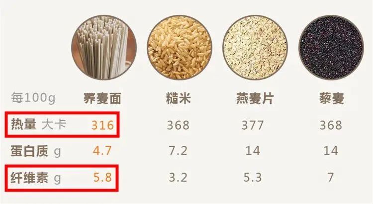 相比燕麦、藜麦这些食材,荞麦面的热量也低,仅为316大卡,纤维素含量更高,达到了5.8!