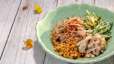 鸡腿肉煮好后切成丝,准备小香葱、黄瓜丝、胡萝卜丝、花生米等配料;再根据个人口味调个酱汁,上面一浇,大功告成!