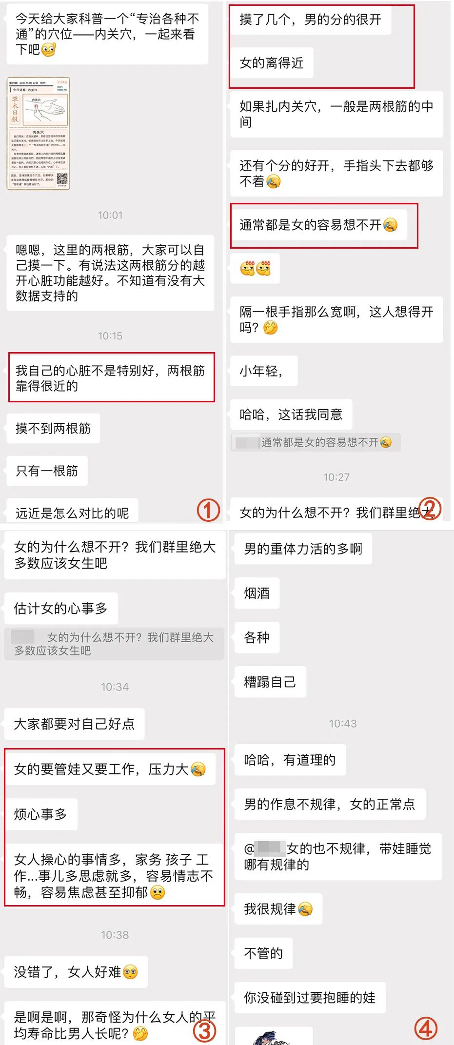 上周,我们在群里给大家推荐了一个“专治各种不通”的穴位——内关穴,结果引发了一波讨论潮,群里女神们纷纷感叹女性因为工作、孩子等,会思虑更多。