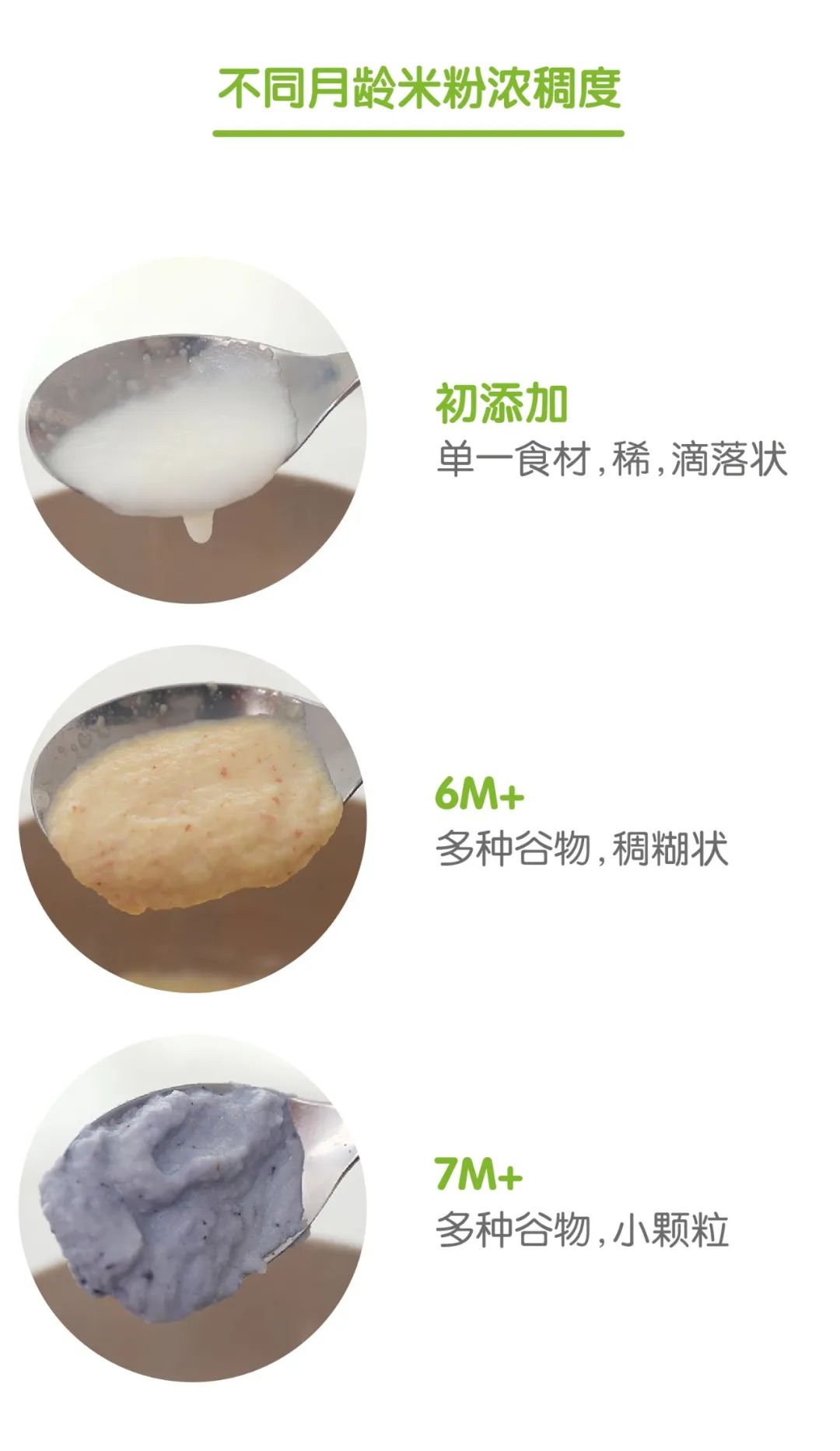 辅食添加的头1-2个月,宝宝还是以泥糊状食物为主,稠度可以参考下面米粉的浓稠度来调节。再之后,泥糊状食物便可以逐渐被颗粒状食物替代了。