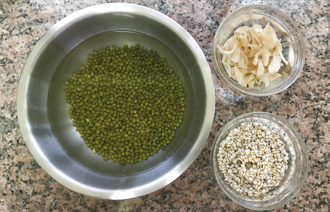 2、绿豆、薏仁、百合用水浸泡1个小时;