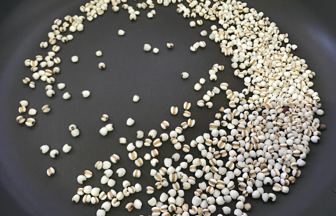 1、锅中注入1500ml清水烧开,倒入绿豆和薏仁;