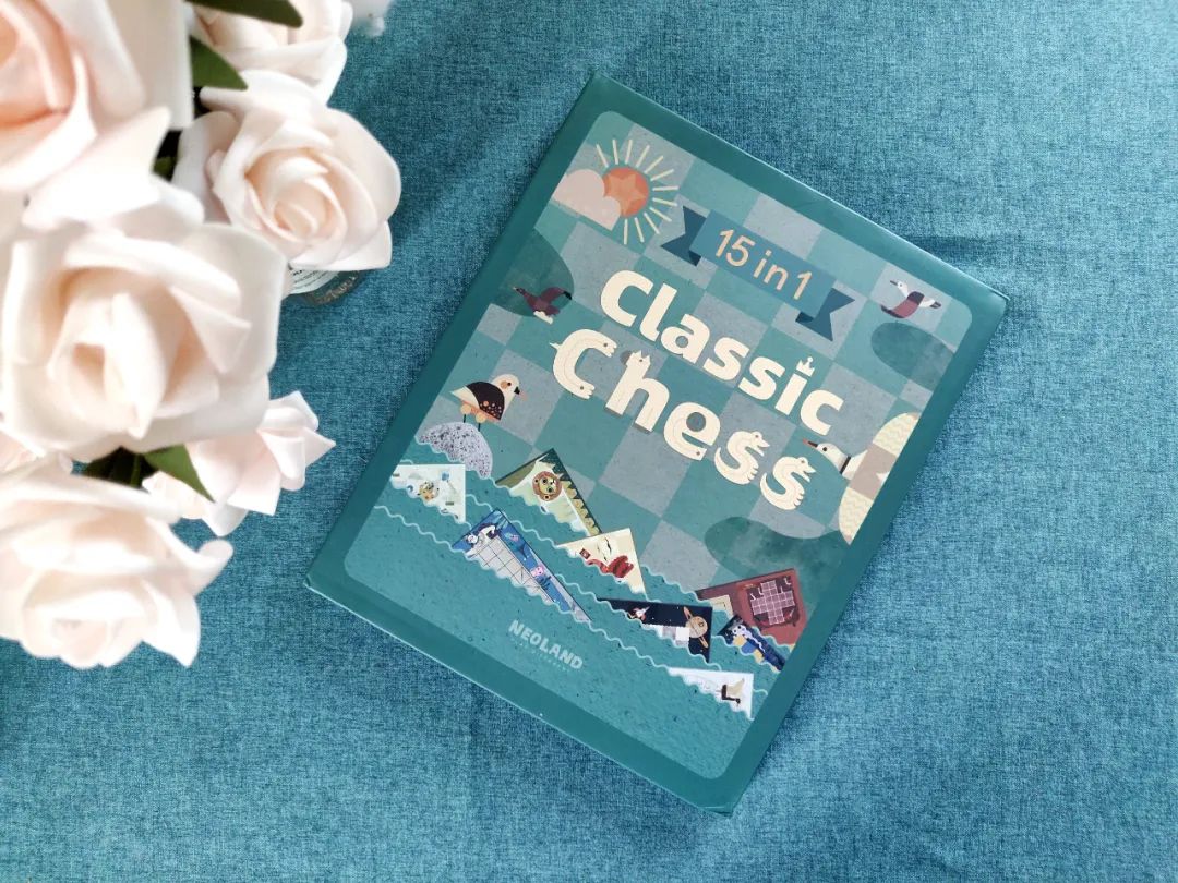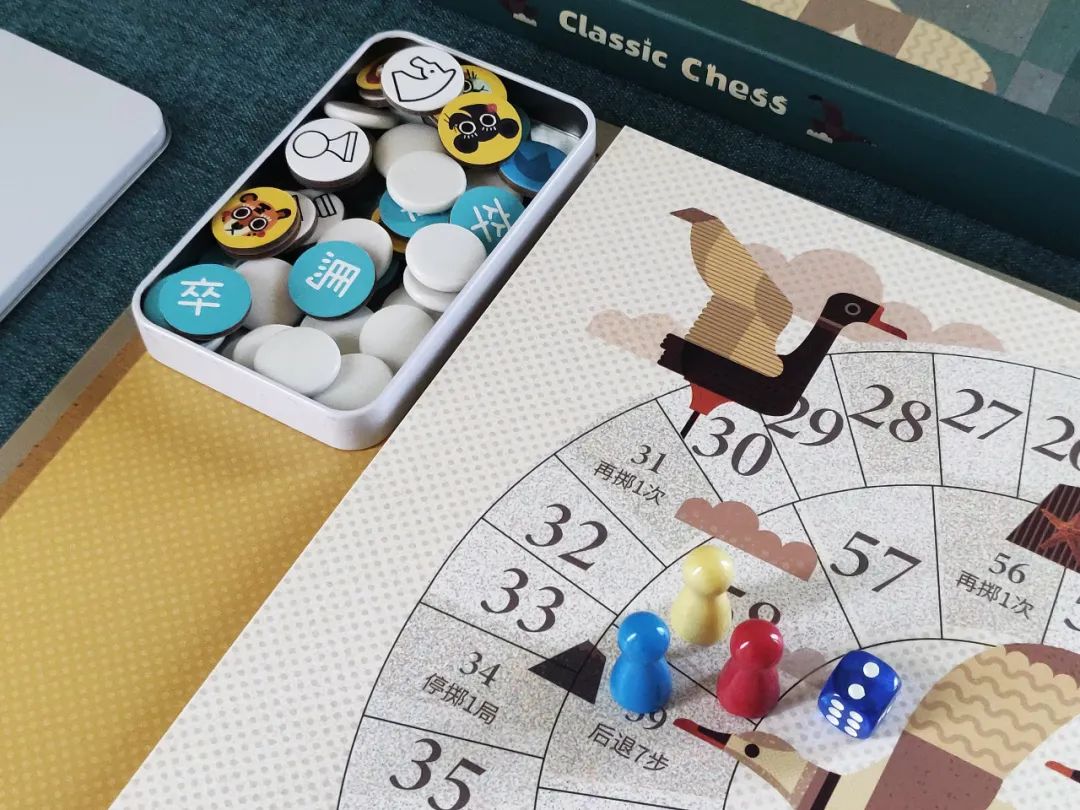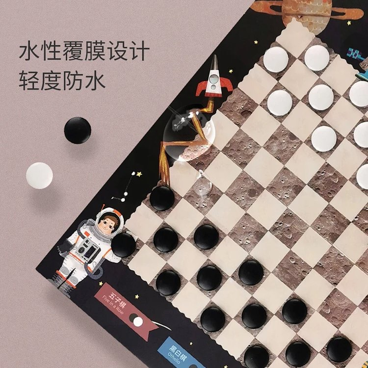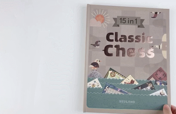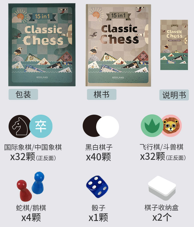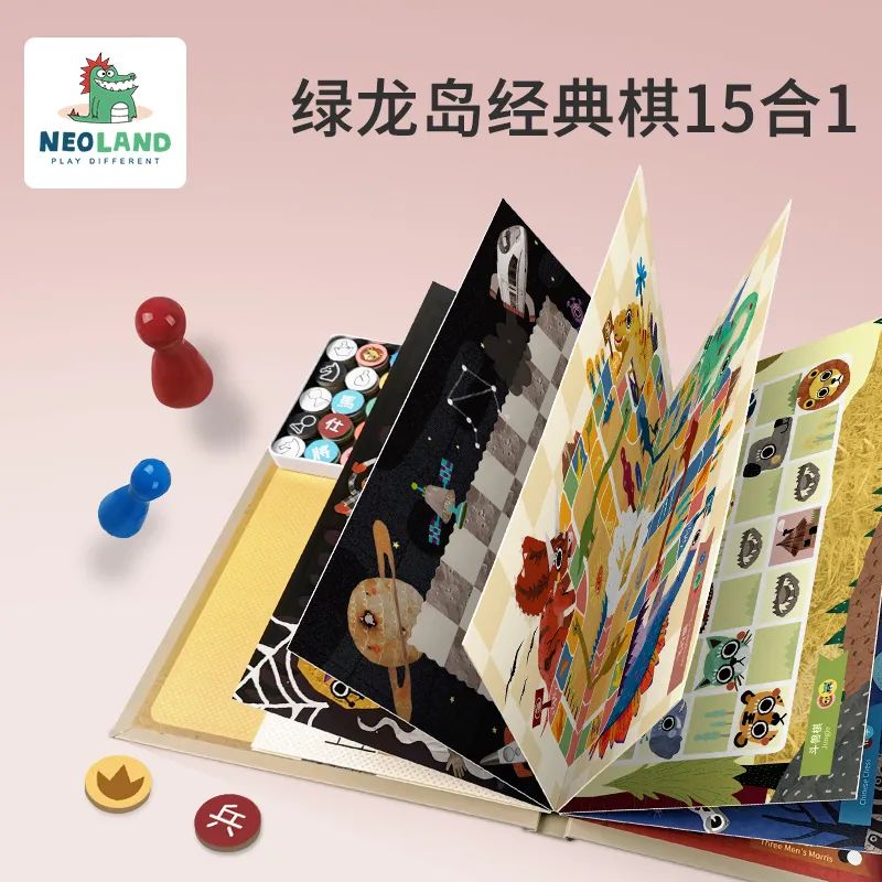 采用书本式折叠设计,把15种棋的棋盘做成了一本书,孩子可以像翻书一样,打开就能玩转所有的棋,比需要一片片拿出来的棋盘方便太多了。