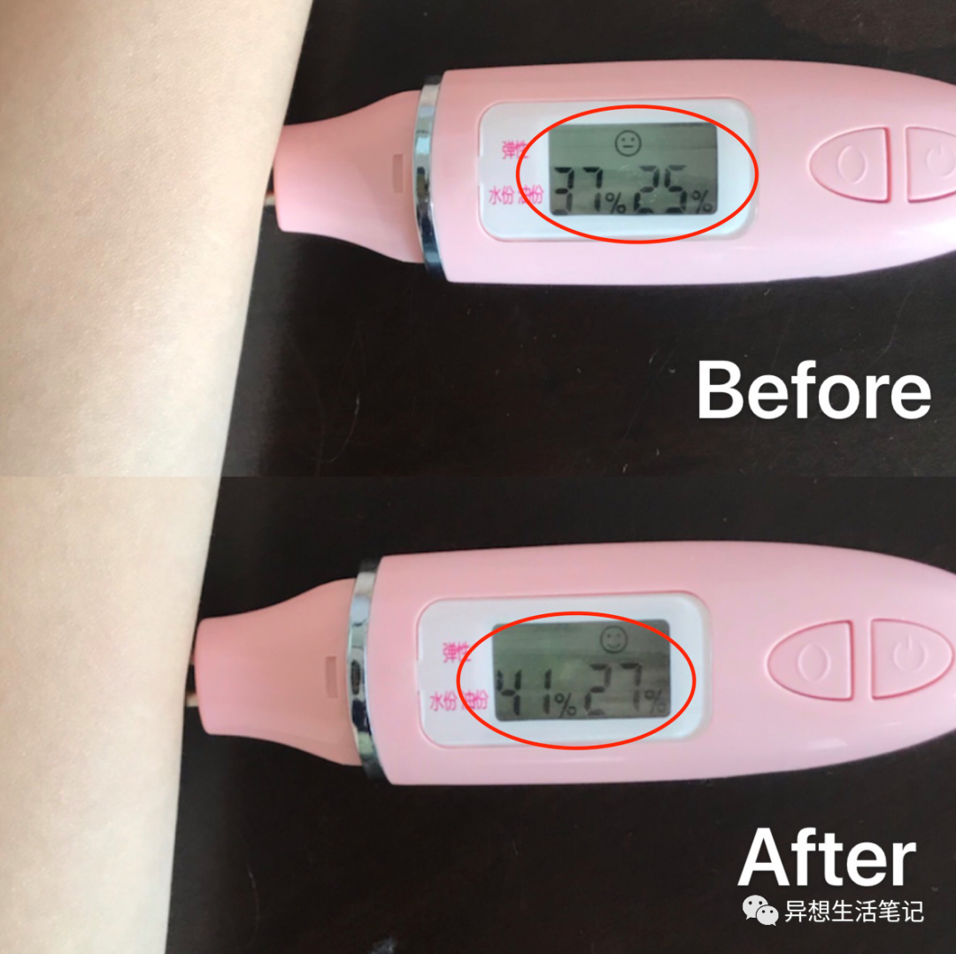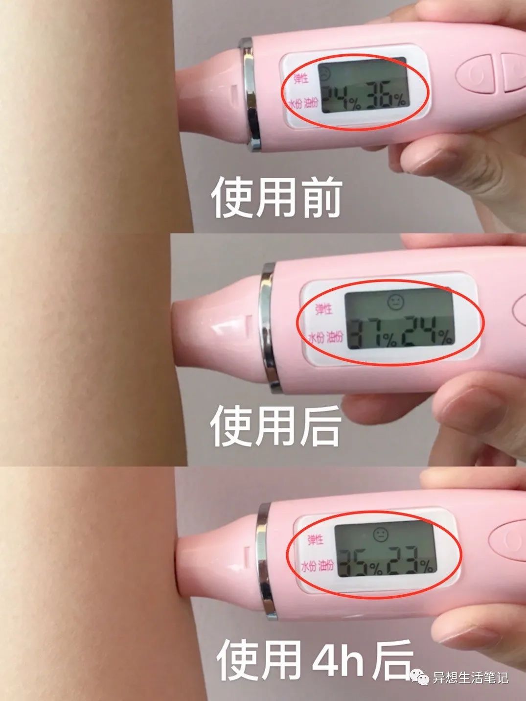涂上后能即时感受到肌肤吸了水,给大家拍了使用前、使用后及使用4小时后的水分对比图👇