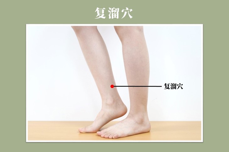 ● 然后用拇指指腹顺时针按摩复溜穴5分钟,直到酸痛感为止。(此穴位在跟腱后缘以及与足内踝尖中间向上三横指处)
