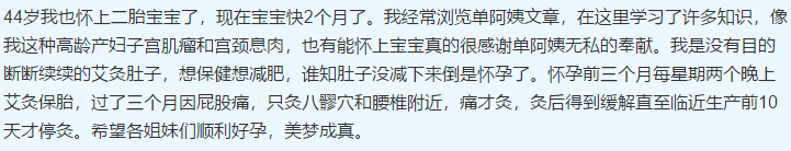 44岁我也怀上二胎宝宝了,现在宝宝快2个月了。我经常浏览单阿姨文章,在这里学习了许多知识,像我这种高龄产妇子宫肌瘤和宫颈息肉,也有能怀上宝宝真的很感谢单阿姨无私的奉献。我是没有目的断断续续的艾灸肚子,想保健想减肥,谁知肚子没减下来倒是怀孕了。怀孕前三个月每星期两个晚上艾灸保胎,过了三个月因屁股痛,只灸八髎穴和腰椎附近,痛才灸,灸后得到缓解直至临近生产前10天才停灸。希望各姐妹们顺利好孕,美梦成真。