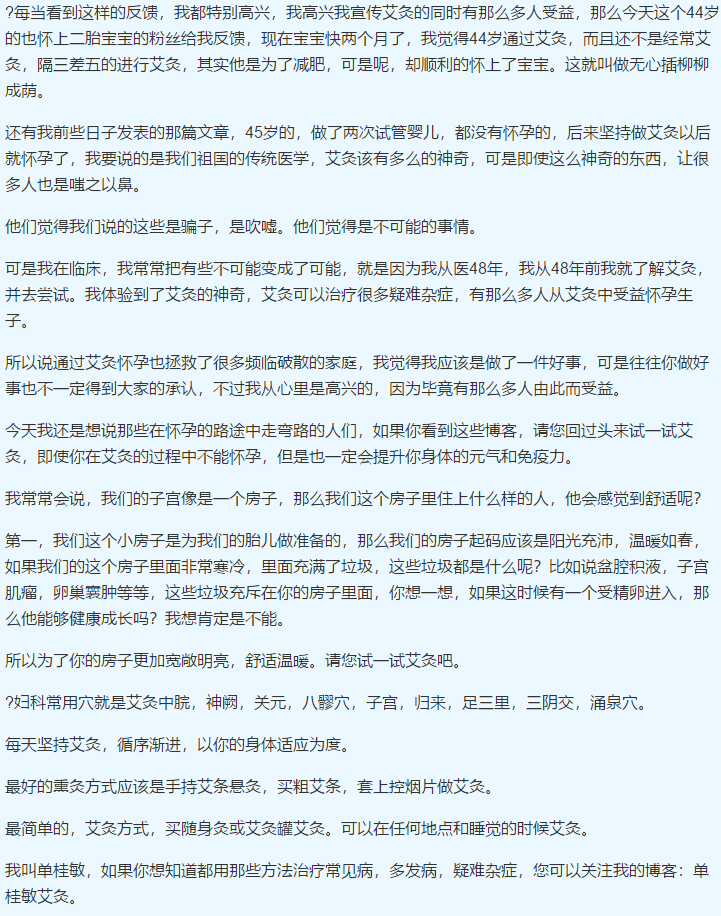 还有我前些日子发表的那篇文章,45岁的,做了两次试管婴儿,都没有怀孕的,后来坚持做艾灸以后就怀孕了,我要说的是我们祖国的传统医学,艾灸该有多么的神奇,可是即使这么神奇的东西,让很多人也是嗤之以鼻。