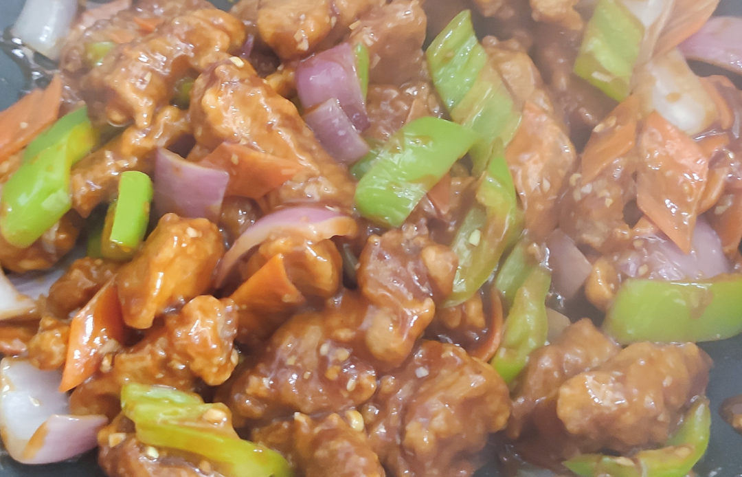 锅里留少许底油,葱、姜、蒜片爆锅,放入泡发好的木耳(10-20朵),胡萝卜片(8-10片),洋葱,青椒翻炒,待有香味后加入半勺料酒,2勺酱油,半勺老抽,1平勺白糖,少半碗水(吃饭小碗),调点盐和鸡精,勾入薄芡(半平勺玉米淀粉,2勺水搅匀),加入蒜末,镇江香醋(如果没有可以放入陈醋,或者清醋);