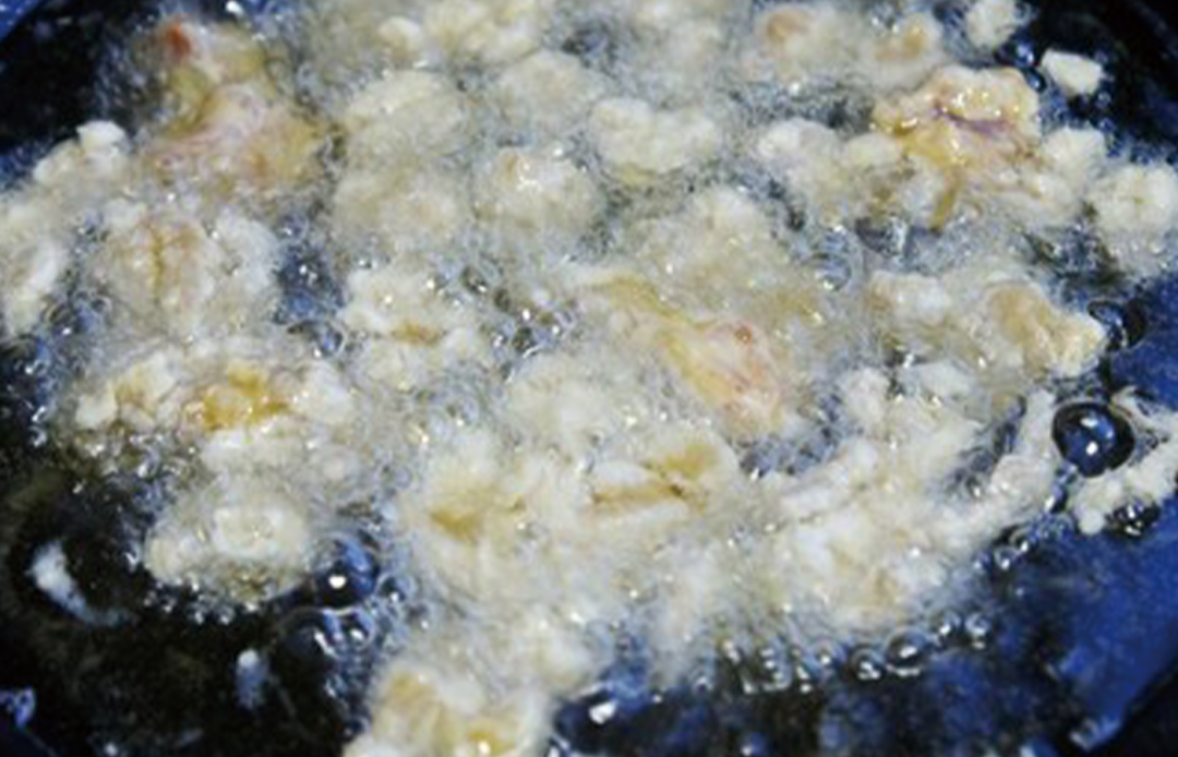 锅里倒入半锅豆油,没烧到微微起烟后关火,待烟下去后把火打开,调成中火,把肉段用手轻轻抓一抓,然后一个一个放入锅里,成型后捞出来;