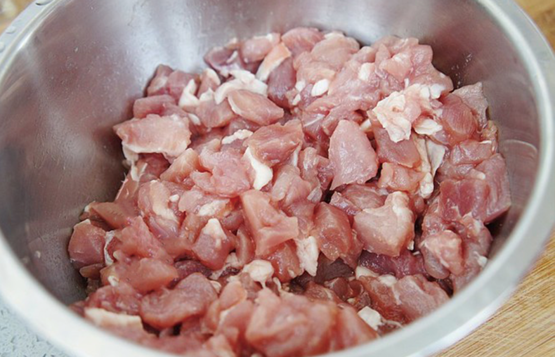 猪肉切成片,用刀拍两下,然后改刀切成食指粗细的条,再改成骰子大小的丁,加入1捏白胡椒粉,1勺料酒(喝汤匙勺),1捏盐抓匀,腌渍8-10分钟;